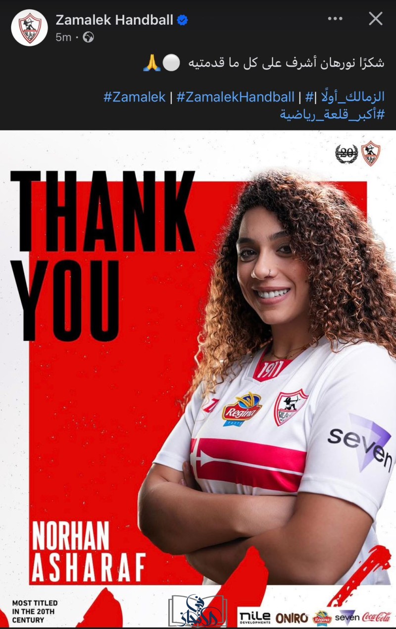 وجهت الصفحة الرسمية لكرة اليد بنادي الزمالك رسالة شكر وتقدير إلى اللاعبة نورهان أشرف، وذلك بعد إعلانها الاعتزال اللعب نهائياً عقب دخولها القفص الذهبي.