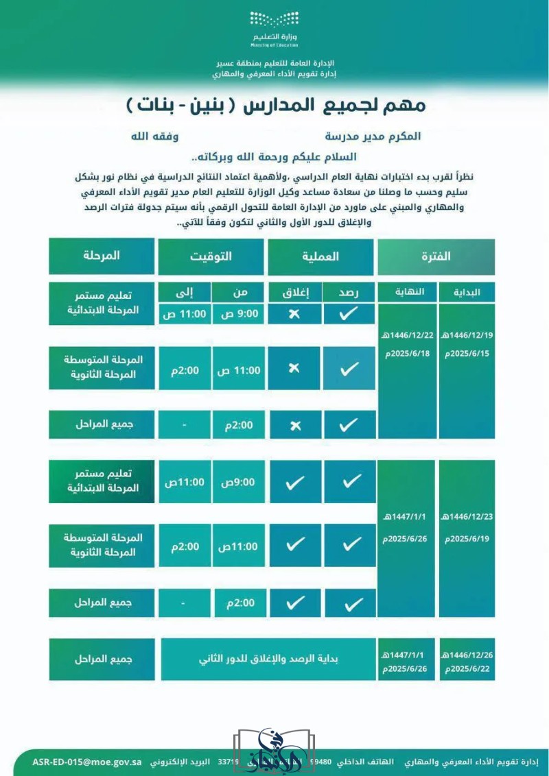 تُهيب وزارة التعليم السعودية بالطلاب وأولياء الأمور إلى التحلي بالصبر والهدوء خلال فترة إعلان النتائج، وتؤكد على أن جميع النتائج ستكون متاحة عبر نظام نور في أقرب وقت ممكن. كما تدعو الوزارة إلى تجنب الانسياق وراء الشائعات والمعلومات المغلوطة التي قد تنتشر عبر وسائل التواصل الاجتماعي، والاعتماد فقط على المصادر الرسمية للمعلومات. وتتمنى الوزارة لجميع الطلاب التوفيق والنجاح في مسيرتهم التعليمية.